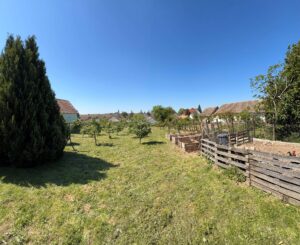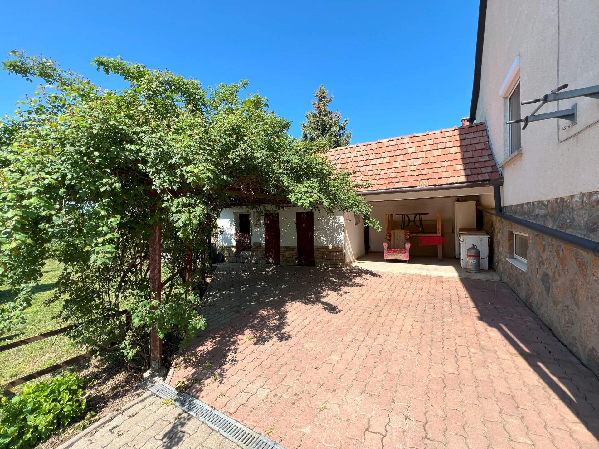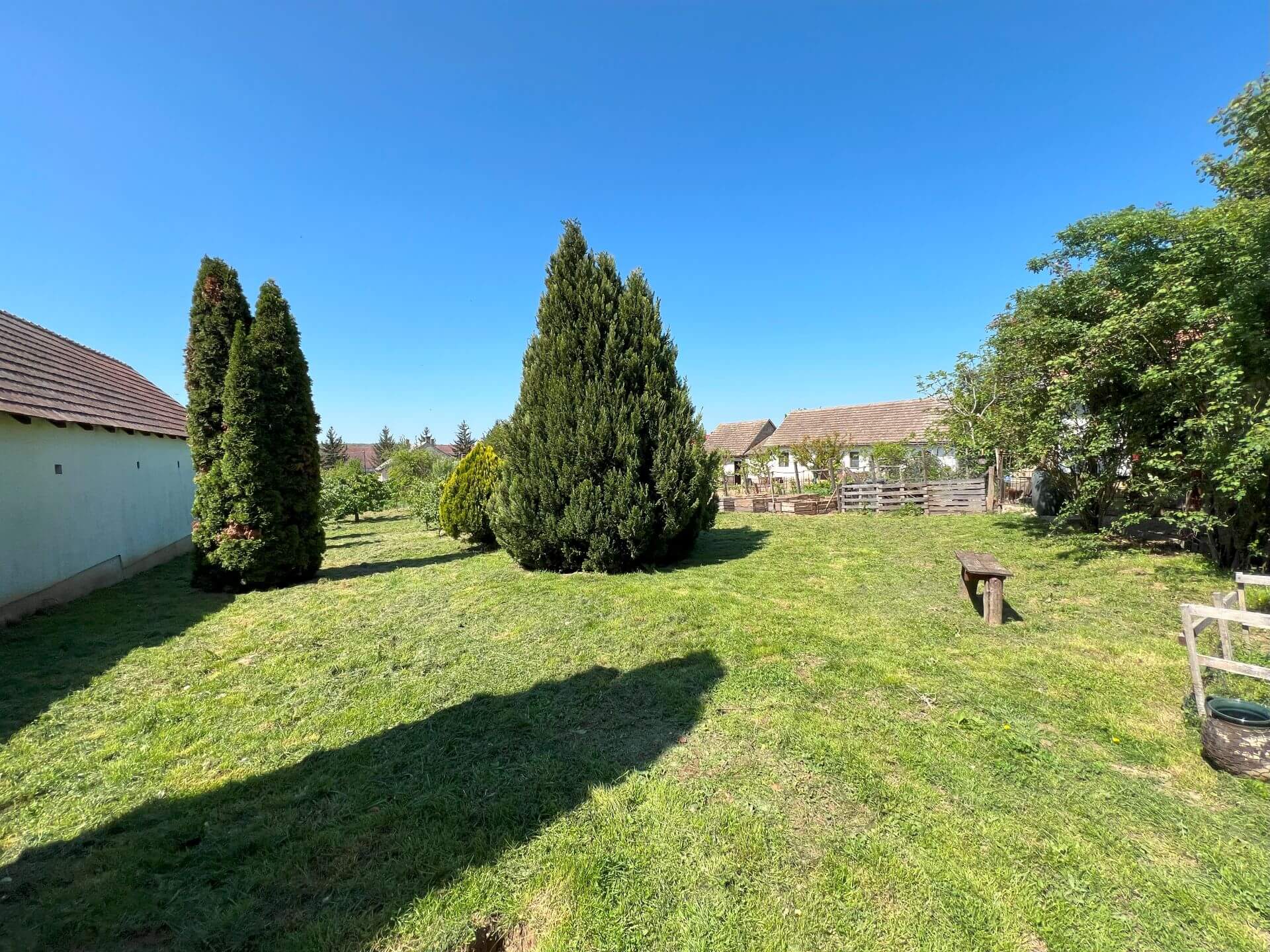 Telek: A 997 m²-es, részben térkövezett és gondosan füvesített telken féltetős kocsibeálló és több tároló biztosítja a mindennapi kényelmet. Az udvar kialakítása lehetővé teszi kisebb haszonállatok tartását is, míg a kert hátsó részét ízlésesen elrendezett gyümölcsfák teszik hangulatossá.