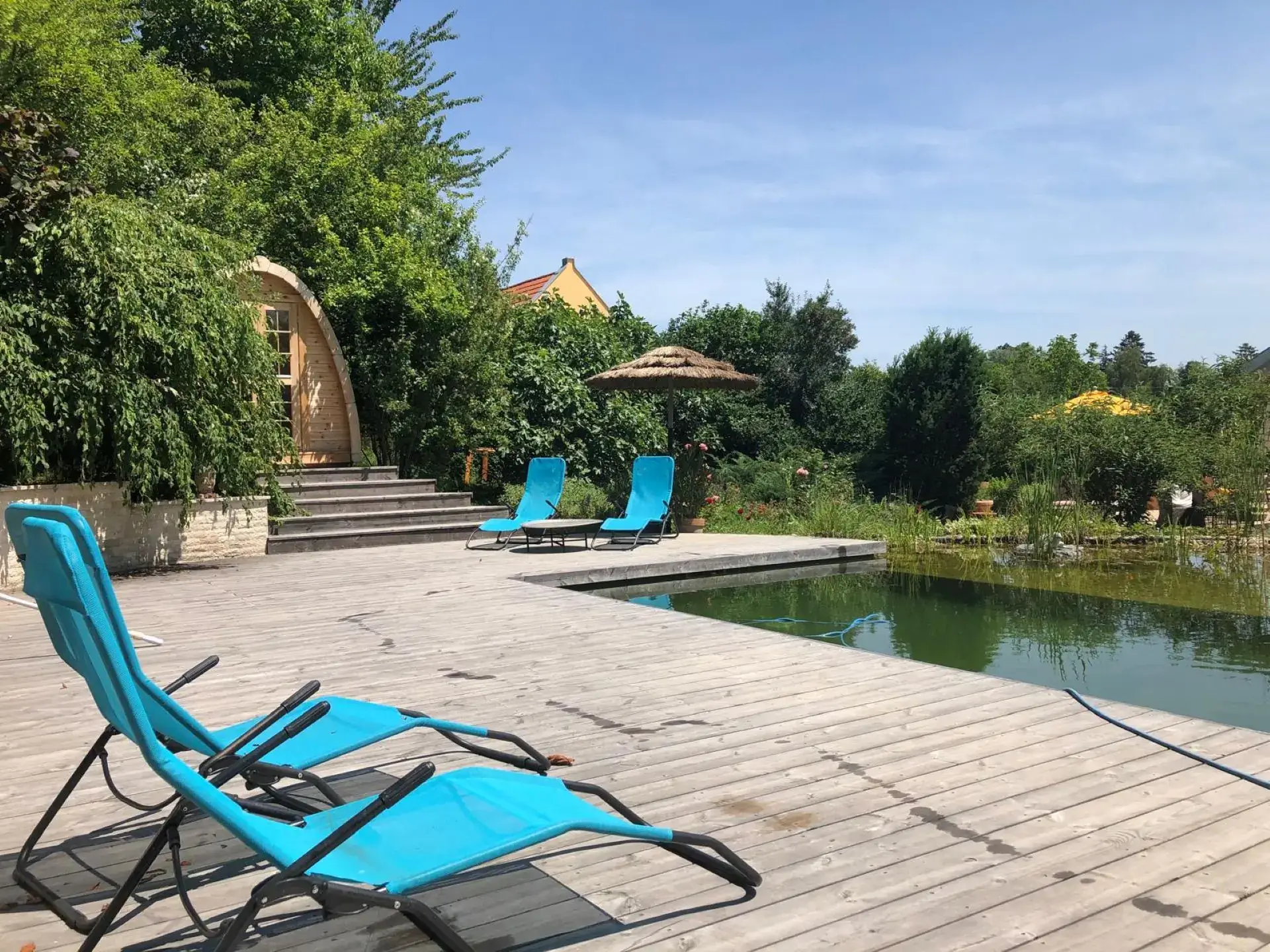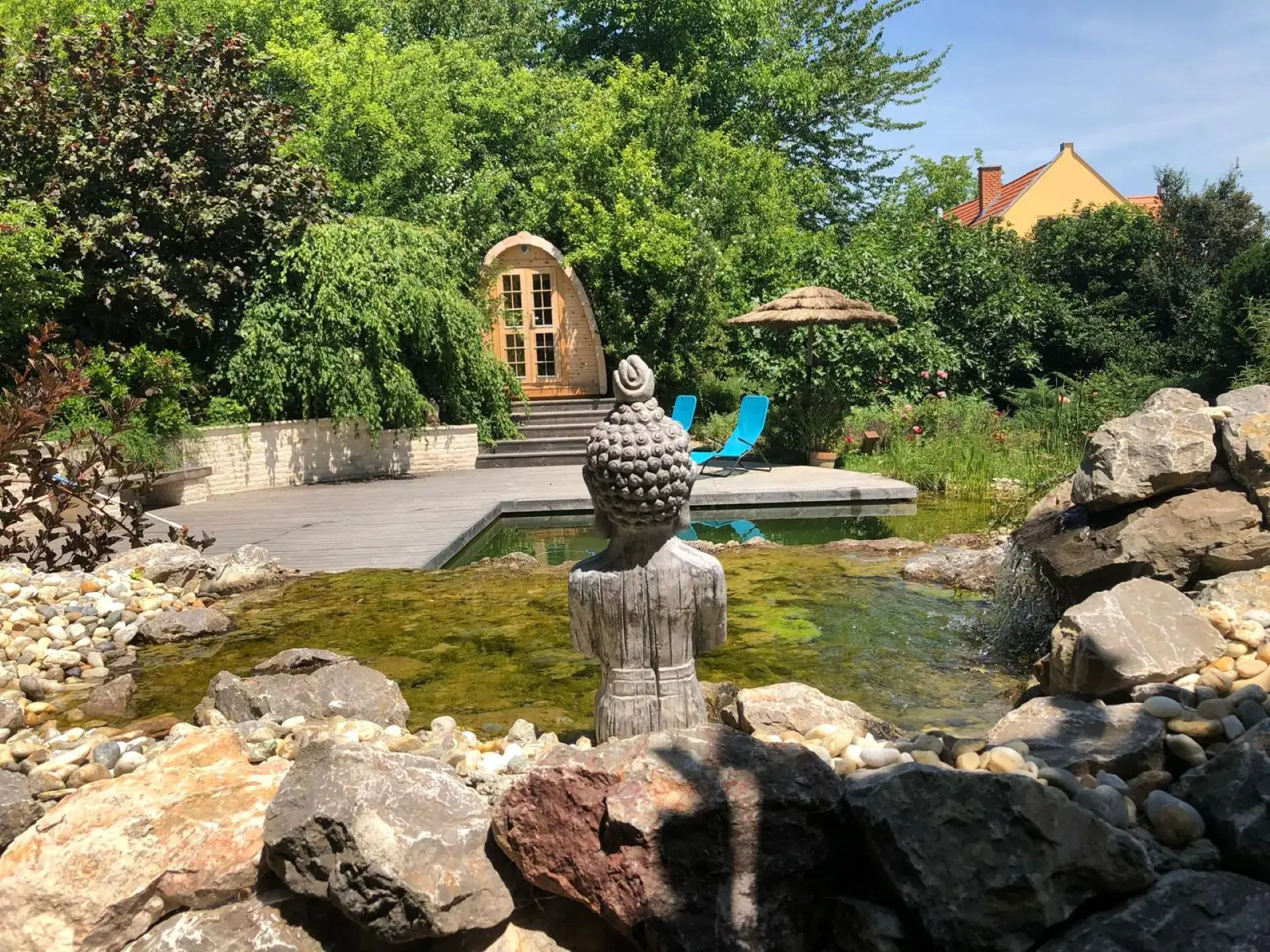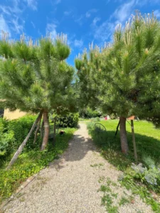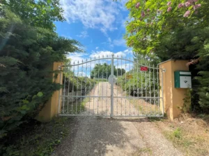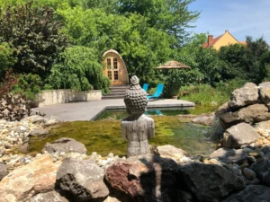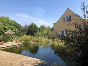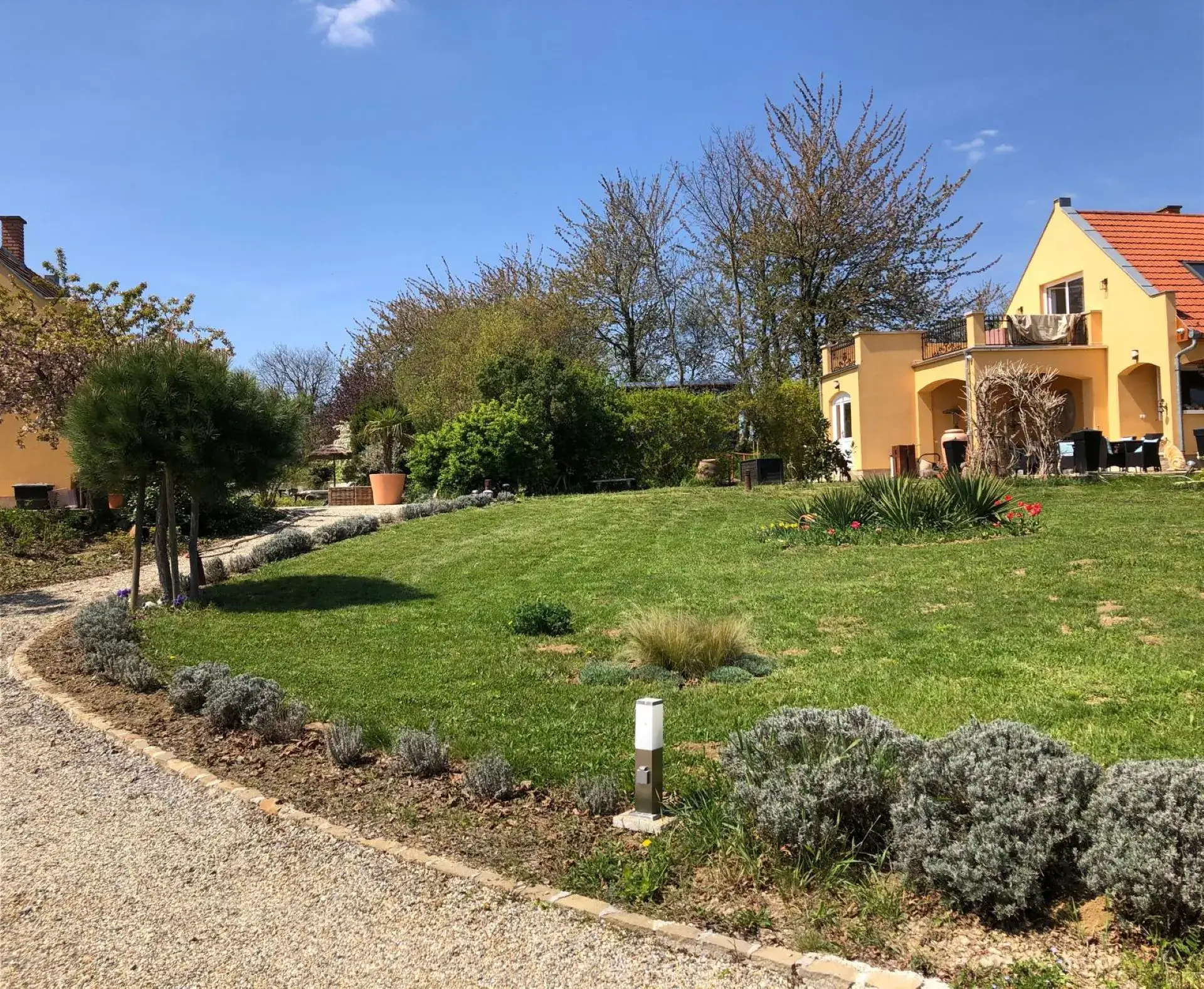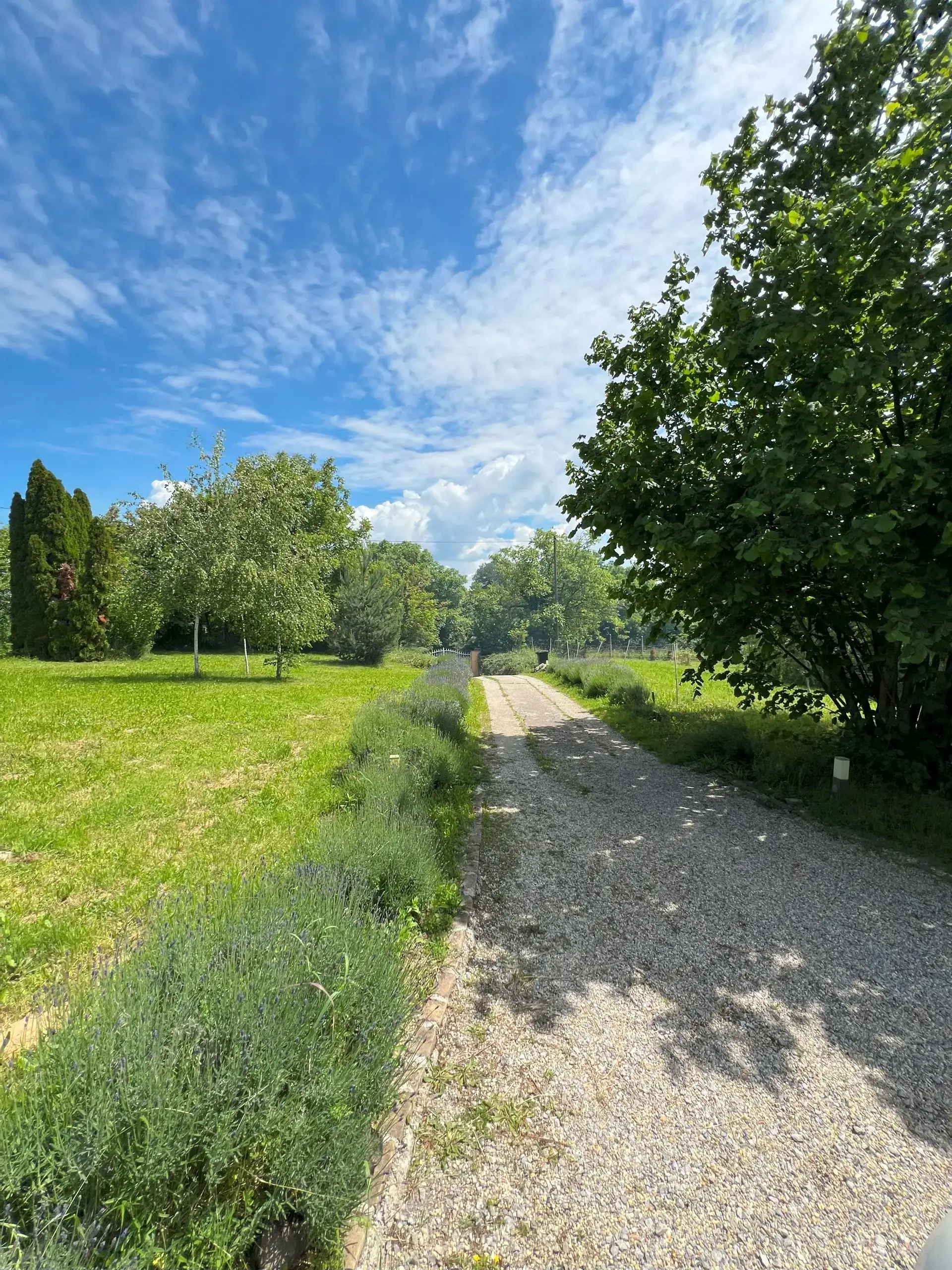 Telek: A több mint 7700 négyzetméteres, 2 méter magas vadkerítéssel körbekerített, gondozott, parkosított telek minden részletében a természet és az otthonosság harmóniáját tükrözi. Itt idős dió-, mogyoró-, fenyő-, lucfenyő- és gyümölcsfák, valamint két nagy fügefa is megtalálható. A birtokra egy elegáns kovácsoltvas kapun keresztül juthatunk be, majd egy levendulával szegélyezett út egészen a házig vezet, már az első pillanattól megidézve a mediterrán vidékek nyugodt életérzését. A kert központi látványeleme a természetes, vegyszermentes biotó, elektromos árammal működő patak/vízesés, különféle szűrők és a tó növényei tisztítanak. A tó mellett egy finn szauna is helyet kapott, így a pihenés és feltöltődés garantált.